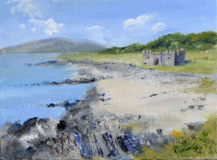 The Bathing Hut, Knockbrex, oil, 18x13cm canvas, framed.